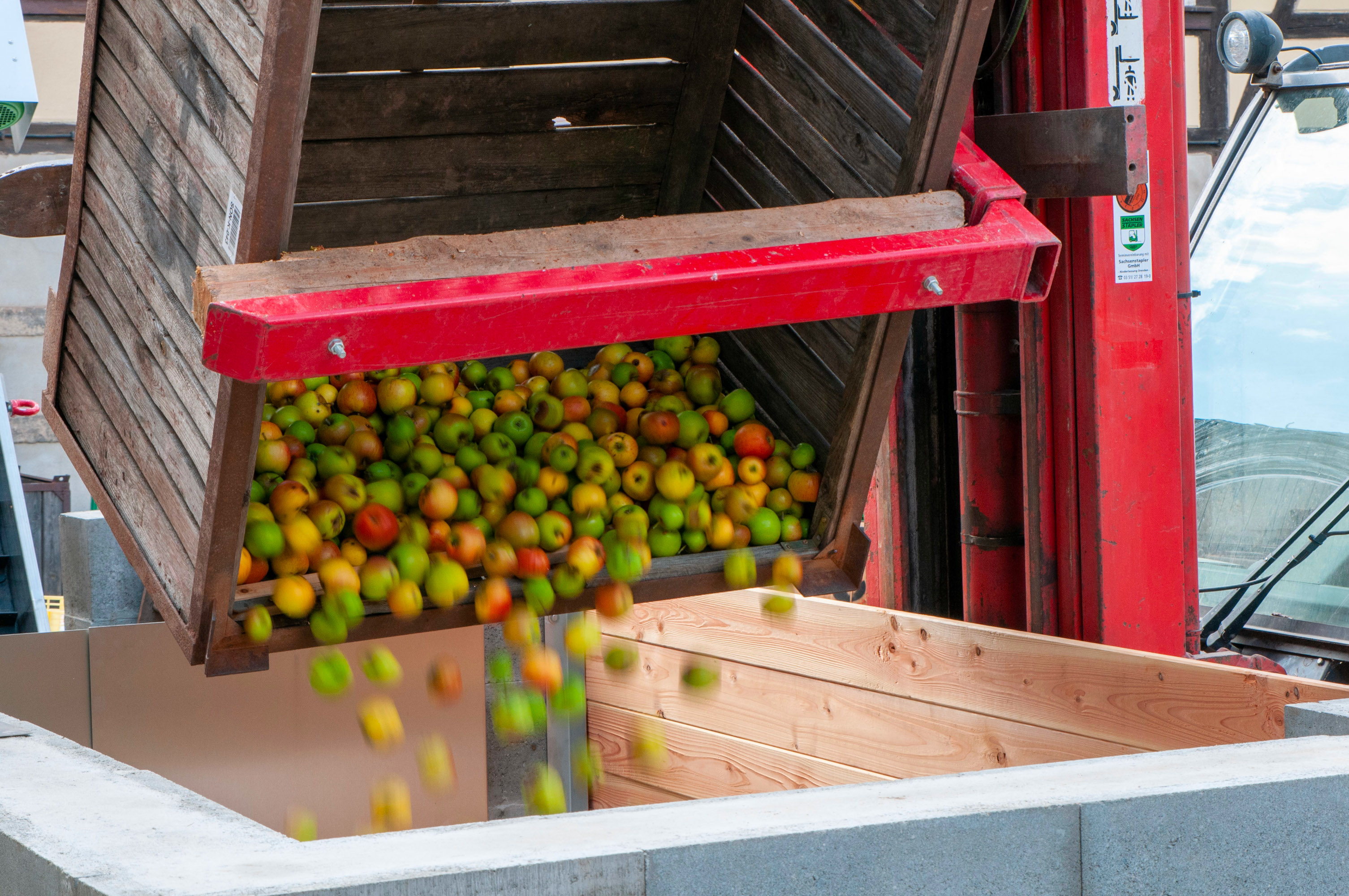 Unser Saft wird kurz nach der Ernte der Früchte durch Mahlen und Pressen hergestellt. Damit sich der Saft lange hält wird er anschließend pasteurisiert und in die Bag-in-Box-Verpackungen abgefüllt – oder seit 2019 auch in 1L-Glasflaschen. Da wir viele unterschiedliche Apfelsorten verarbeiten, schmeckt auch der Saft nicht einheitlich.